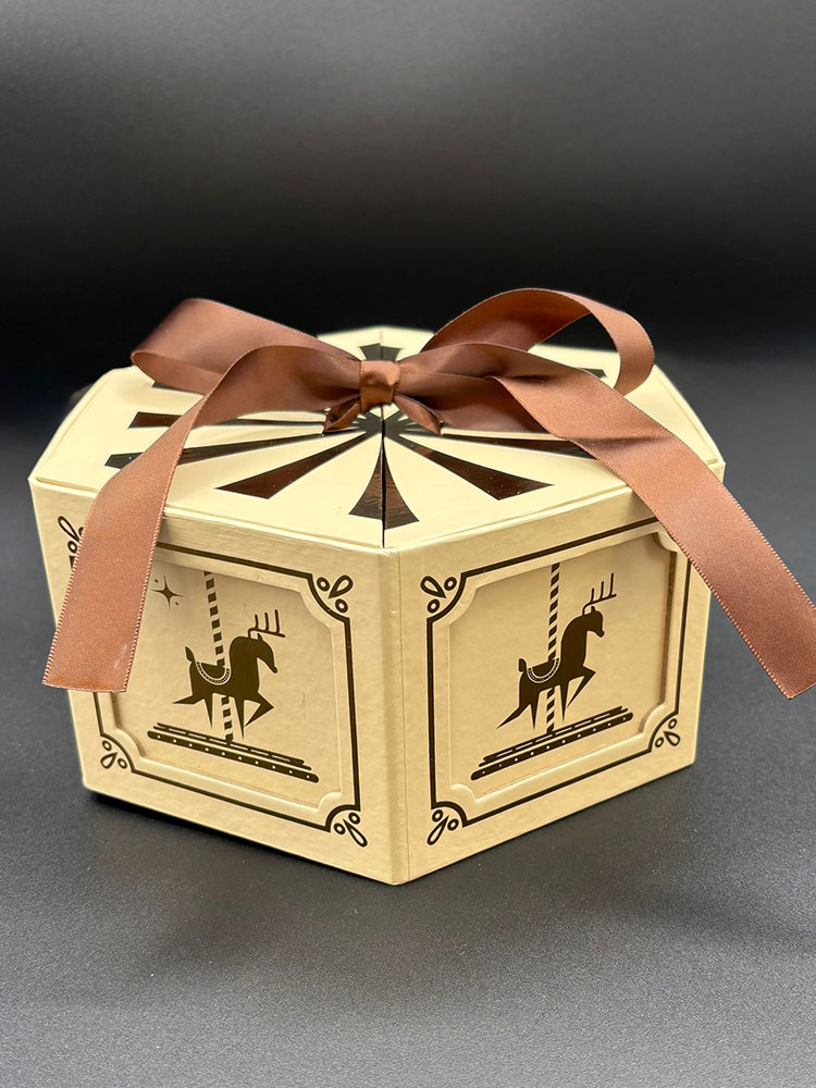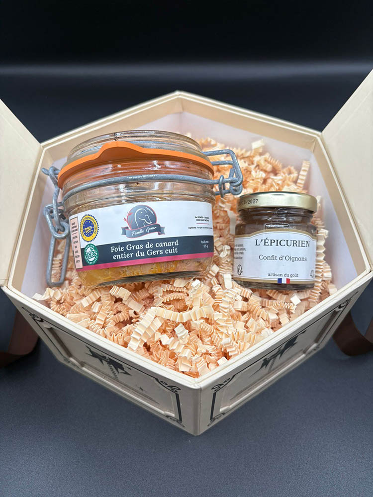 Le coffret Carrousel est composé d’une verrine artisanale de foie gras de canard entier cuit et d’un confit d’oignon.